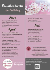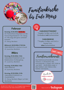 Gottesdienste für Familien, Aktionstage und -wochen, Lebendiger Adventskalender, Familienwochenende und vieles andere mehr gibt es hier bei uns in der Pfarrei. Wir freuen uns, wenn auch Ihr bei dem ein anderen Termin dabei seid. Herzliche Einladung.